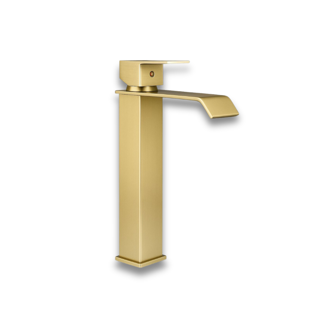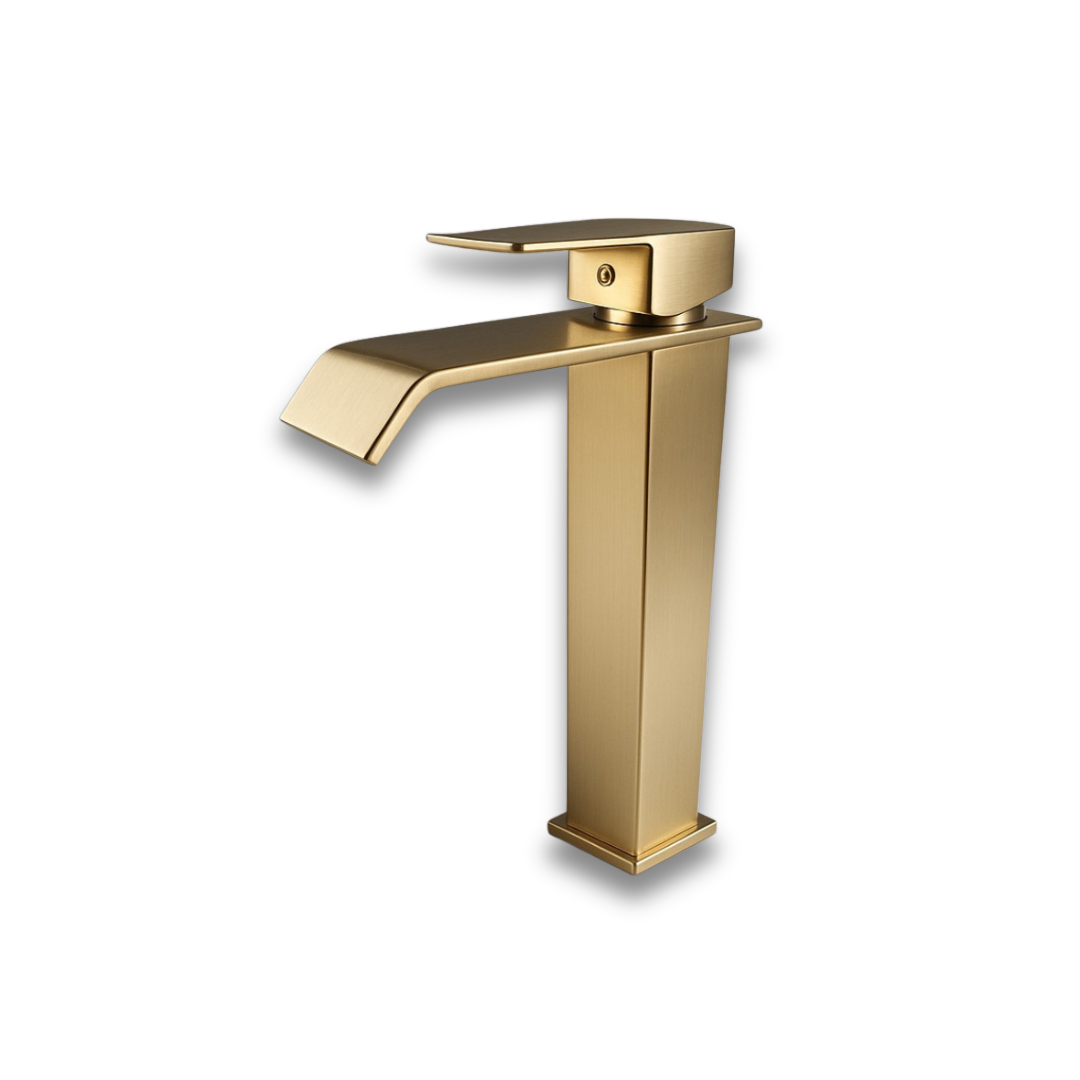 Grifería Oro Cepillado Alta | Monocontrol de Lujo para Lavamanos